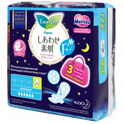 Тонкие японские ночные прокладки с крылышками Laurier F (Лорие, Лауриер), размер XL, 6 капель – идеальный выбор для тех, кто ценит комфорт, ощущение чистоты и максимальную защиту от протеканий в критические дни ночью. Хорошо подходят для обильных выделений в период месячных. Моментально впитывают влагу, не липнут к коже и не раздражают её во время сна. Нежнейшая нетканная поверхность, едва заметные дополнительные оборочки от бокового протекания и метка на впитывающем слое, указывающая, как правильно прикрепить прокладку, выгодно отличают ночные Laurier F от других популярных женских гигиенических прокладок. Полимерный абсорбент обеспечивает быстрое впитывание и надёжное запирание влаги внутри. Мягкий волнистый верхний слой сокращает контакт чувствительной кожи с влагой и снижает до минимума риск возникновения раздражений. Воздухопроницаемый нижний слой прокладки не пропускает выделения, но превосходно выводит прелый воздух, обеспечивая максимальный комфорт и ощущение свежести. Удлинённая впитывающая прокладка Laurier F легко принимает форму тела, не скручивается и не отклеивается от белья из натуральных тканей, даже если Вы часто переворачиваетесь во сне. Ночные женские гигиенические прокладки Laurier F от производителя японских подгузников Merries (KAO Corporation) протестированы дерматологически в Японии и подходят для самой чувствительной и нежной кожи. Подойдут в качестве прокладок для подростков в период установления менструации у девочек. Каждая прокладка Лорие выпускается в индивидуальной упаковке, которая занимает мало места в сумочке и позволяет сохранить гигиеничность и чистоту прокладки до момента использования. Мини-пачка ночных Laurier F размера XL содержит 3 прокладки. Её удобно захватить с собой в гости, в командировку или в отпуск. Длина каждой прокладки размера XL (6 капель) – 30 см. Со средствами личной гигиены для женщин Laurier (Лорие) Вы будете чувствовать себя защищённой и уверенной в любой день менструального цикла. Позаботьтесь о важном, а о Вас позаботится Laurier.