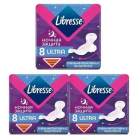 Прокладки Либресс Ультра Гуднайт имеют 8 штук в упаковке и упакованы в 3 упаковки. Они не ароматизированы, что делает их подходящими для женщин, предпочитающих нейтральный аромат.