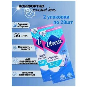Ежедневные прокладки Libresse "Свежесть и защита" представляют собой высококачественную продукцию для женщин из Европы. В упаковке 28 штук, что обеспечивает комфорт и свежесть на протяжении всего дня.