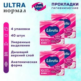 Прокладки женские гигиенические LIBRESSE Ultra Нормал с мягкой поверхностью, набор из 4 упаковок по 10 штук, всего в наборе 40 прокладок.