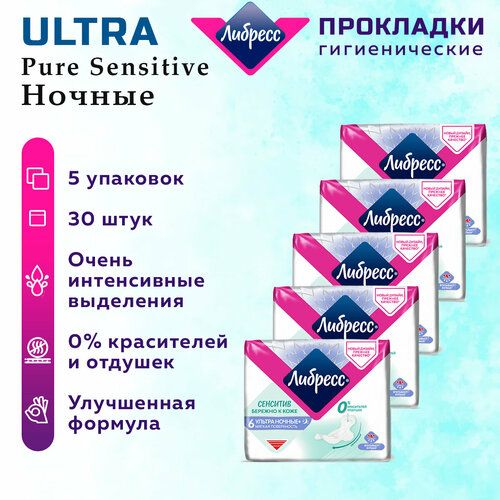 Прокладки женские гигиенические Libresse Ultra Pure Sensitive Ночные с мягкой поверхностью, набор из 5 упаковок по 6 штук, всего в наборе 30 прокладок.