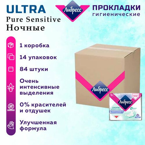 Прокладки женские гигиенические Libresse Ultra Pure Sensitive Ночные с мягкой поверхностью, 1 заводская коробка, набор из 14 упаковок по 6 штук, всего в наборе 84 прокладки.
