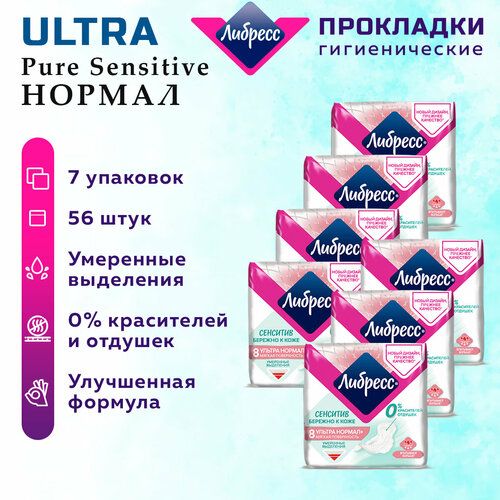 Прокладки женские гигиенические Libresse Ultra Pure Sensitive Нормал с мягкой поверхностью, набор из 7 упаковок по 8 штук, всего в наборе 56 прокладок.