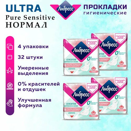 Прокладки женские гигиенические Libresse Ultra Pure Sensitive Нормал с мягкой поверхностью, набор из 4 упаковок по 8 штук, всего в наборе 32 прокладки.