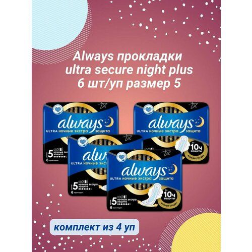 Always Ultra Night (5) с системой InstantDry мгновенно впитывают влагу и удерживают ее внутри, обеспечивая до 100% защиты и уверенности. Always Ultra оснащены технологией нейтрализации запаха, которая блокирует неприятный запах, а не просто маскирует его. Always Ultra толщиной всего 3 мм дарят комфорт и обеспечивают непревзойденную защиту во время менструации. Имеют удлиненную на 60% заднюю часть, обеспечивая еще лучшую защиту от протеканий. Созданы специально для защиты в ночное время. Always Ultra имеют защитные контуры SecureGuard и содержат гель, который впитывает и удерживает влагу, помогая предотвращать протекания.