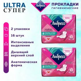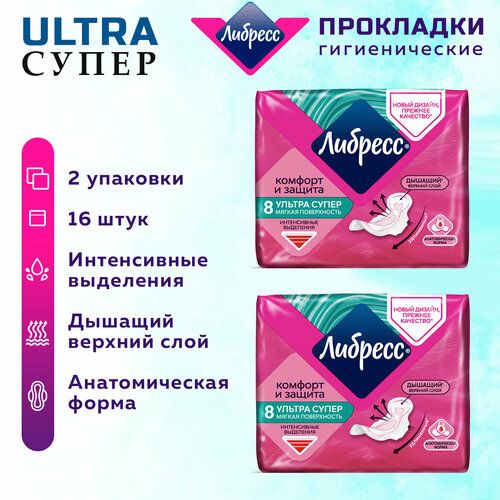 Прокладки женские гигиенические LIBRESSE Ultra Супер с мягкой поверхностью с мягкой поверхностью, набор из 2 упаковок по 8 штук, всего в наборе 16 прокладок.