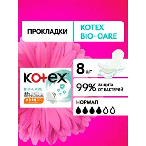 Прокладки женские гигиенические Kotex Bio-Care Нормал 4 капли для умеренных выделений с природным антибактериальным компонентом внутри прокладки обеспечивают контроль запаха и защиту 99% от роста бактерий. Прокладки для женщин БИО КЭА плотно прилегают, адаптируются под анатомию тела и надежно защищают от протеканий. Супермягкий инновационный верхний слой нежно соприкасается с кожей, даря ощущения комфорта. Прокладка с крылышками Котекс Bio-Care НОРМАЛ лучше прилегает к телу - до 0% протеканий. Прокладки Котекс гибкие и в точности повторяют форму тела, плотно прилегают и обеспечивают полноценную защиту. В нежной женственной упаковке — 8 гигиенических дневных прокладок с крылышками.