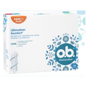 Тампоны O.B. Super ProComfort (впитываемость 4 капли) для использования в дни с интенсивными менструальными выделениями обеспечат полноценную защиту от протеканий в критические дни не сковывая ваши движения и даря свободу действий. В одной упаковке 54 штуки. Ведущие активный образ жизни женщины, девушки и девочки в последнее время в определенные моменты жизни все чаще предпочитают тампоны обычным прокладкам. Плюс этого маленького предмета женской гигиены в том, что он совершенно незаметен даже в очень облегающих нарядах. Гигиенические тампоны женские в отличие от прокладки адаптируются к строению твоего тела сразу после введения благодаря технологии DynamicFit (ДайнэмикФит) с 3D раскрытием, предотвращая попадания волокон внутрь. Особая текстура и форма эффективно помогают удерживать жидкость и перенаправлять ее в верхнюю часть по переплетающимся спиралевидным желобкам. Такая технология спиралевидных желобков обеспечивает более эффективное направление жидкости внутрь тампона, а технология StayDry (СтэйДрай) позволяет нити тампона оставаться сухой для дополнительного ощущения чистоты. Протестировано гинекологами: идеально впитывает и не пропускает влагу. Тампоны гигиенические женские имеют уникальное шелковистое покрытие верхнего слоя ob SilckTouch (СилкТач), которые на 100% из растительного сырья, без вредных химических веществ, хлорного отбеливателя, ароматизаторов или отдушек произведены согласно высочайшим требованиям качества на производственных линиях одного из крупнейших производителей на заводе во Франции. Они также окажут прекрасную поддержку во время первых дней цикла после родов. Средство без аппликатора - тампоны ОБИ супер про комфорт не вызывают дискомфорта во время использования, легко скользит и, поэтому средства личной гигиены обеспечат легкое и максимально комфортное введение. Благодаря наличию индивидуальной упаковки их можно носить с собой в сумочке