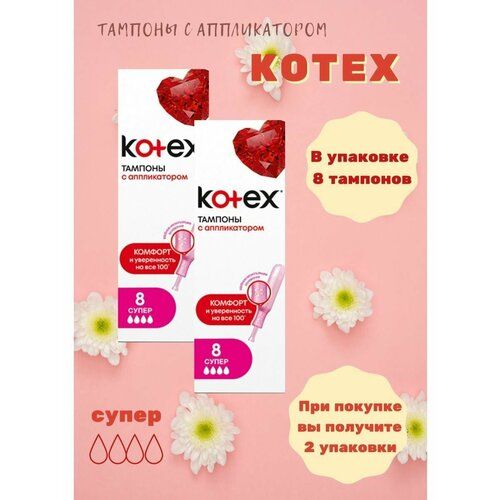 kotex супер тампоны с аппликатором - гарантируют максимально комфортное введение благодаря поверхности silky cover, а гидрофильные волокна ultra sorb быстро впитывают влагу. Специальная голубая зона, состоящая из гидрофильных волокон ultra sorb быстро проводит влагу, удерживают ее внутри и обеспечивают надежную защиту от протеканий. Гладкий и эластичный кончик аппликатора и удобное нескользящее основание обеспечивают максимально комфортное и гигиеническое введение. Уникальная система открытия поверни-и-открой для удобного использования. Тампон необходимо менять каждые 4 часа, включая ночное время. Ночью допускается промежуток - 8 часов. Для большей уверенности используйте дополнительно к тампону ежедневную прокладку.