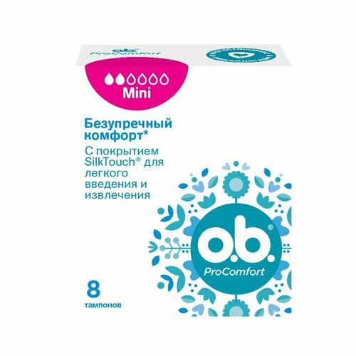 Тампоны o. b. ProComfort Mini – самый лучший вариант для тех, кто только начинает пользоваться тампонами. Это самый маленький из тампонов o. b. и его легко вводить благодаря маленькому размеру, узкому закругленному кончику и уникальному шелковистому покрытию SilkTouch. Благодаря легкому введению он идеально подходит для девушек и женщин, которые только начинают использовать тампоны.