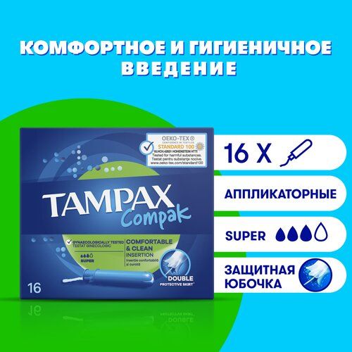 Женские Гигиенические тампоны с аппликатором TAMPAX Compak Super, 16 шт.