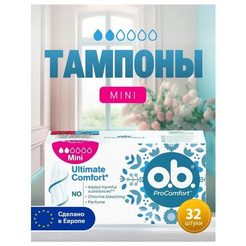 НАЙТИ ВЫГОДНЕЕ - Тампоны O.B. ProComfort Mini, уровень впитывания 2 капли, 100 % хлопок, 32 штуки