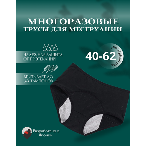 Трусы для менструации, это многоразовое впитывающее нижнее белье для критических дней, которое превосходно защищает от протеканий и запаха. Трусики для месячных надежно защитят днем и ночью. Сделаны из мягкой, дышащей, не кружевной ткани. Выглядят как обычные, тонкие и незаметные под одеждой как бесшовные трусики, но оснащены четырехслойной впитывающей ластовицей. Ластовица впитывает до 4-х тампонов выделений. Вы можете свободно носить светлые вещи в критические дни, трусы для месячных защитят одежду и постельное белье. Черные трусы для менструации позволяют экономить деньги на тампонах, прокладках и других средствах гигиены. Чтобы увеличить срок жизни трусов, замочите их в прохладной воде сразу после использования. При обильных выделениях рекомендуем носить трусики совместно с тампоном или менструальной чашей. Подойдут как трусы для беременных, как послеродовые в больнице, а также при возрастном недержании. Набор трусов для месячных будет прекрасным подарком.