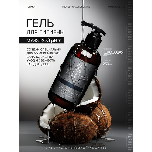 Натуральный интимный гель мыло для мужчин BARBARO предназначен для деликатных частей тела. Интимный гель предназначен для ежедневного очищения половых органов, интимных мест мужчин. Средство для мужской гигиены деликатно очищает кожу и устраняет неприятные запахи. Жидкое мыло не вызывает пересушивание кожи, воспаления, и не нарушает мужской pH, а наоборот восстанавливает, смягчает и очищает кожу, избавляет от неприятного запаха, выравнивает цвет кожи. В течении дня под крайней плотью полового члена скапливается смегма- смесь выделительного секрета, отмерших клеток эпителия и влаги. Она является благоприятной средой для развития болезнетворных микробов. Именно поэтому так важен тщательный туалет половых органов с использованием тёплой воды и деликатного моющего средства. При этом мужчинам не подходят женские интимные средства, в них преобладает кислая среда, а для мужчин подходит щелочная. Обычные агрессивные средства могут вызывать жжение, раздражение в паху, нарушают естественность микрофлоры слизистых и сухость кожи. Жидкий интимный гель гораздо лучше воспринимается чувствительной кожей паха и мягче воздействует на неё. Жидкая консистенция позволяет сохранить полезные свойства экстрактов и натуральных компонентов, например экстракт календулы оказывает успокаивающее и регенерирующее действие. Экстракт ромашки усиливает процессы регенерации в клетках кожи, снимает раздражение и покраснение. Молочная кислота стабилизирует уровень pH, нормализует процесс обновления клеток, улучшает цвет кожи и упругость. А мягкие поверхностно моющие вещества не раздражают даже самую чувствительную кожу. Гель для интимного ухода рекомендуется применять ежедневно, утром и вечером, а также после физических нагрузок, купания в бассейне и различных водоёмах, до и после интимной близости. Красивый аромат мякоти кокоса способствует расслаблению, нормализует эмоциональное состояние человека, является афродизиаком. Вливает в душу удовольствие и наслаждение. Очень нравится девушкам.