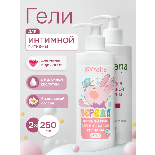 Набор для интимной гигиены от Леврана для мам и дочек, состоящий из 2-х средств, поможет вам позаботиться о ежедневной гигиене женской части семьи. В состав набора входят Очищающее средство для интимной гигиены с молочной кислотой, 250 мл и Детский мягкий гель для интимной гигиены Череда, 250 мл, который можно использовать с рождения для девочек. Очень мягкое и бережное очищение самой нежной кожи тела. Предназначен для очищения чувствительных, интимных участков женского тела. Гель для интимной гигиены восстанавливает и поддерживает естественный рН-баланс, подходит для ежедневного применения. Обладает легким натуральным ароматом. В основе средства для мамы тщательно подобранные компоненты натурального происхождения: эфирные масла лаванды и розовой герани, экстракты ромашки, одуванчика и календулы, которые бережно очищают и оказывают благотворное влияние на слизистую, обеспечивает мгновенный и длительный комфорт. Устраняет ощущение сухости, стянутости, жжения, обладает противовоспалительными и заживляющими свойствами, прекрасно смягчают кожу, оказывают лечебное воздействие, создают благоприятную среду для оптимального кислотно-щелочного баланса. pH 4.0. Подходит для регулярного ежедневного применения, использовать утром и вечером или по мере необходимости. Гели не содержат мыло. Мягкий гель для интимной гигиены для девочек можно использовать с момента рождения и до 14 лет. Экстрамягкая формула с уровнем pH 5.5 отлично подходит для подмывания детей и подростков, а молочная кислота помогает поддерживать естественную микрофлору. Тщательно подобранные мягкие ингредиенты деликатно нормализуют естественную микрофлору, поддерживая естественный уровень pH, что особенно важно для маленьких леди. Растительные компоненты оказывают профилактическое действие, сохраняя эффективную защиту слизистой от инфекций. Экстракт череды обладает смягчающим и противовоспалительным свойствами. Благодаря воздействию на тонкую, чувствительную детскую кожу, он питает и смягчает ее. Без парабенов, красителей и этанола. Применение: небольшое количество геля нанести на наружные половые органы и смыть.