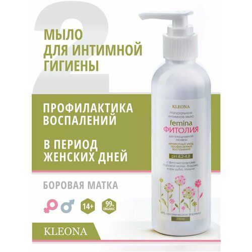 Жидкое мыло для интимной гигиены "Femina Фитолия" с молочной кислотой разработано специально для чувствительной женской зоны, обеспечивая мягкое и деликатное очищение. Натуральная формула средства снижает количество бактерий и микробов, предотвращает развитие дисбактериоза, инфекций и раздражений. Содержащиеся в составе компоненты нежно очищают, поддерживая естественный кислотно-щелочной баланс и нейтрализуют неприятный запах. Антибактериальное мыло для ежедневного подмывания бережно заботится о коже интимной зоны, не вызывает сухости или зуда. Гипоаллергенный зеленый гель содержит более 99% ингредиентов растительного происхождения, которые помогают предотвратить появление дискомфорта и обеспечивают ощущение свежести на весь день. Органическая уходовая косметика от нашего бренда не содержит вредных химических веществ, отдушек, парабены или SLS, что делает его безопасным для применения беременными девушкам, кормящих женщин и девочек подростков. Эффективен во время менструации, помогает поддерживать естественный защитный барьер и оказывает успокаивающий эффект. Удобный флакон с дозатором обеспечивает удобство использования - нанесите небольшое количество интим мыла на ладони и равномерно распределите пенку. Диапазон рН 4,2-4,8. Экономично расходуется, поэтому одной упаковки хватает на длительное время. Позаботьтесь о своем здоровье вместе с KLEONA
