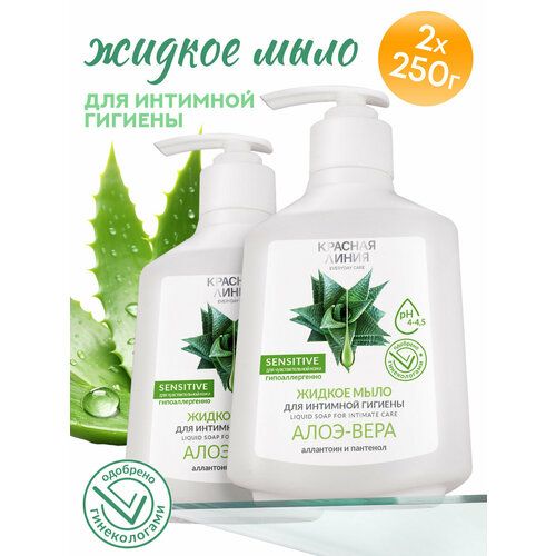 Жидкое мыло для интимной гигиены алоэ вера с увлажняющим и заживляющим комплексом - оптимальный вариант для базового ухода интимной гигиены для женщин и интимной гигиены для мужчин. Интимный гель одобрен гинекологами и дерматологами: он обладает правильным pH, соответствующим натуральной микрофлоре интимной зоны, а также мягким составом, который восстановливает естественный баланс, деликатно очищает и устраняет запах. Алоэ-вера устраняет раздражение и препятствует сухости, что поддерживает правильную микрофлору интимной зоны. Аллантоин способствует синтезу коллагена для тонуса и эластичности кожи. Пантенол подавляет воспалительные процессы и улучшает процессы заживления при микроповреждениях. Это средство для интимной гигиены очень экономично в расходовании, потому что имеет удобный диспенсер для мыла и отлично пенится. Мыло жидкое торговой марки «Красная линия» рекомендовано для ежедневного использования, подходит для применения несколько раз в сутки. Косметика и средства по уходу за телом нашего производства одобрены гинекологами, имеют сертификаты качества государственного образца.