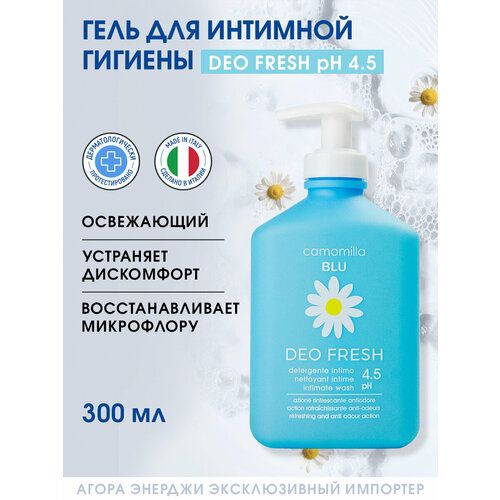 Освежающий гель для интимной гигиены Camomilla Blu Deo Fresh. Предназначен для мягкого очищения, нейтрализации неприятного запаха, восстановления кислотно-щелочного баланса и естественной микрофлоры. У женской интим зоны более кислый pH, чем у остального тела. Поэтому для подростков, беременных и женщин с началом менструации рекомендуются средства с уровнем pH 4,5. Важно не использовать обычное мыло, которое может нарушать микрофлору, вызвать сухость, зуд или раздражение.