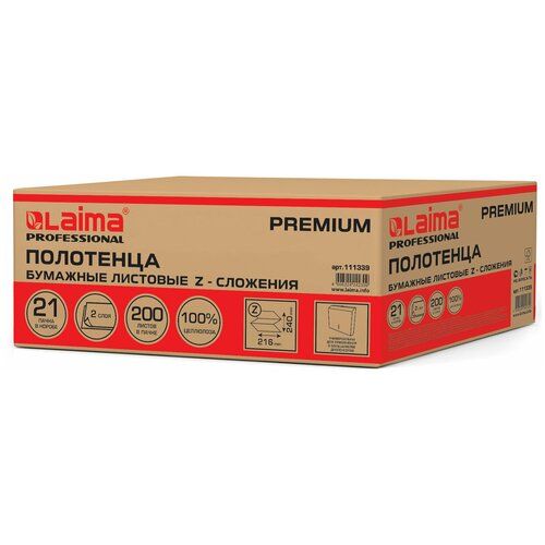 Полотенца LAIMA 111339Полотенца бумажные 200 шт, LAIMA (H2) PREMIUM, 2-слойные, белые, комплект 21 пачка, 24х21,6, Z-сложение, 111339Бумажные полотенца LAIMA - лучший способ поддержания высокого уровня гигиены. Отлично удаляют жир, впитывают масла, воду и другие загрязнения. Подходят для использования дома и в общественных заведениях, оптимальны для мест с большой проходимостью. Полотенца из 100% целлюлозы с типом сложения Z имеют два слоя, тиснение и перфорацию отдельных листов. Подходят для диспенсеров системы H2 и совместимы с большинством диспенсеров. Расход - 2 листа за одно посещение. Размер листа - 21,6х24 см. Упаковка вмещает в себя 200 полотенец. 21 штука в спайке. Тип сложения: Z-сложение (Multifold). Артикул: 111339. Диспенсерная система: H2. Серия: Premium. Количество слоев: 2. Перфорация: отдельные листы. Количество в спайке: 21 шт. Количество листов: 200 шт. Длина листа: 21.6 см. Ширина листа: 24 см. Тиснение: да. Ширина пачки/рулона: 21 см. Высота пачки/рулона: 12 см. Глубина пачки/рулона: 10.5 см. Сочетаются с оборудованием других производителей: да. Материал: 100% целлюлоза. Цвет бумаги: белый Бренд - LAIMA. Производитель - Россия. Артикул производителя - 111339. Штрихкод - 4606224242309Характеристики упаковки: Вес: 8,4220 кг. Объем: 0,0552 м3. Размеры: 22,7x58,9x41,3 см.