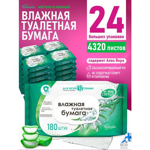 Влажная туалетная бумага Clinija с экстрактом Алоэ вера предназначена для деликатного и бережного очищения. Упаковка содержит 24 пачки по 180 штук, размер одного листа 10*15 см. Рекомендована для всей семьи – для взрослых и детей. Антимикробное и антисептическое действие лосьона успокаивает и заживляет кожу, делая наш продукт незаменимым для всех возрастов. Благодаря натуральным природным волокнам салфетка мягкая, но прочная. Детская влажная туалетная бумага Clinija не рвется как обычная туалетная бумага. Влажная туалетная бумага детская экономна в использовании - ее легко доставать, вытаскивая листы по одному. В пропитывающем лосьоне содержится экстракт Алоэ, благодаря которому создается ощущение свежести и комфорта. Влажная туалетная бумага Clinija соответствует требованиям Европейской ассоциации производители нетканых материалов. Плотно закрывающийся пластиковый клапан сохранит все листы в упаковке влажной туалетной бумаги свежими и влажными до окончания использования.