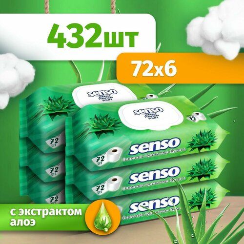 НАЙТИ ВЫГОДНЕЕ - Влажная туалетная бумага Senso с экстрактом Алоэ и Молочной кислотой, 432 штуки, Одноразовые салфетки для гигиены тела и уборки (6 упаковок по 72 шт)