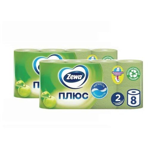 Туалетная бумага Zewa Плюс - это отличное сочетание прочности и мягкости. Она одобрена дерматологами и прекрасно подойдет всем членам вашей семьи – и тем, кому нужна мягкая бумага, и тем, кому важна прочность. Позаботьтесь о себе и своих близких вместе с Zewa. Сенсация Зеленая 2-х слойная туалетная бумага с ароматом яблока. 8 рулонов в упаковке. В комплекте 2 упаковки.