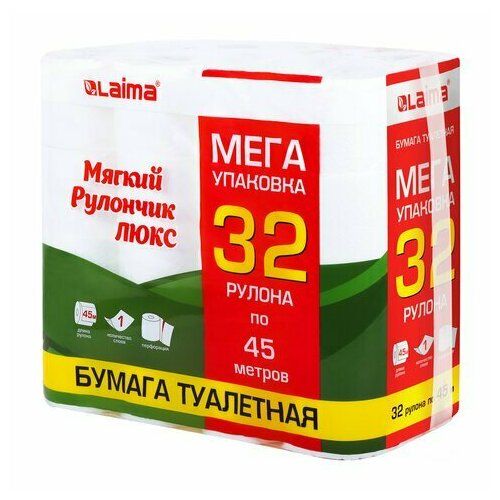 НАЙТИ ВЫГОДНЕЕ - Бумага туалетная бытовая в упаковке / пачке для дома и офиса Мягкий Рулончик белая, 100% целлюлоза, 32 рулона по 45 метров, 1-слойная Laima 114736
