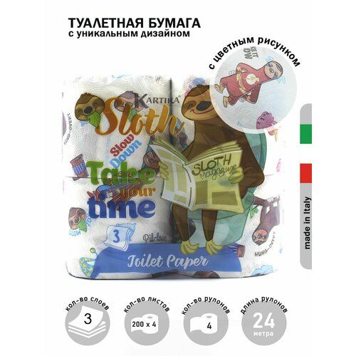 НАЙТИ ВЫГОДНЕЕ - Туалетная бумага с рисунком Ленивец 3 слоя, 4 рулона по 200 листов, World Cart