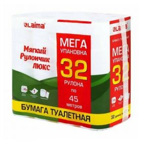 НАЙТИ ВЫГОДНЕЕ - Бумага туалетная бытовая в упаковке / пачке для дома и офиса Мягкий Рулончик белая, 100% целлюлоза, 32 рулона по 45 метров, 1-слойная Laima 114736