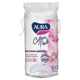 Ватные диски Aura Beauty Cotton pads имеют круглую форму, что позволяет равномерно распределять средство по поверхности кожи и обеспечивает более тщательное очищение.