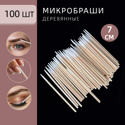 Длина ватных стиков 7 см. Микробраши предназначены для точечного нанесения препаратов или удаления помарок при окрашивании бровей, ресниц или нанесении гель-лака. Тонкие деревянные палочки толщиной не более 2 мм с ватным узким наконечником. Количество в упаковке- 100 шт. (+-5 шт.) Качественные деревянные микробраши с тонким ватным наконечником будут незаменимы при работе с ресницами, бровями или ногтями. Деревянные палочки с тонким ватным наконечником просто незаменимы при подчищении, коррекции и создании идеальных ровных линий при окрашивании и ламинировании бровей, а также для удаления помарок при окрашивании ресниц или макияже, нанесении гель-лака. Такая ватная палочка — это незаменимый инструмент для косметологов и мастеров красоты, бровистов. Они представляют собой небольшие щеточки из мягкого волокна, закрепленного на деревянном стержне. Щетки без ворса помогут убрать излишки лака по краям ногтя или украсить маникюр мелкими декоративными элементами. Данный продукт позволяет эффективно очищать кожу, при снятии макияжа удалять загрязнения и остатки косметики в самых труднодоступных местах. Так же аппликаторы можно использовать при наращивании ресниц - для нанесения обезжиривателя или ремувера. Такой инструмент гарантирует более точное и равномерное нанесение продукта, что повышает их эффективность.