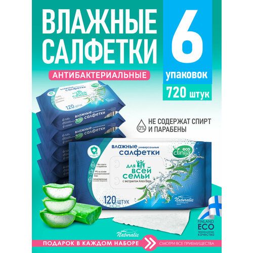НАЙТИ ВЫГОДНЕЕ - Влажные салфетки универсальные с алоэ вера, антибактериальные, 6 упаковок по 120 шт