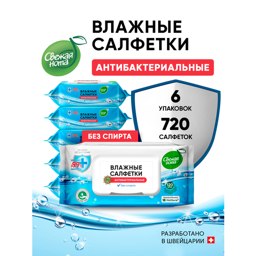 Влажные салфетки антибактериальные от бренда Свежая нота это дополнительная защита вашего организма. Салфетки влажные без спирта отличная альтернатива мылу и воде, когда они не доступны. Антибактериальные влажные салфетки предназначены для ежедневной гигиены кожи рук и тела, а также для обработки разнообразных поверхностей и предметов. Они обеспечивают надежную долговременную защиту от бактерий и некоторых видов вирусов. Качественный мягкий и плотный материал Natlace эффективно удаляет загрязнения. При этом антибактериальные салфетки бережно очищают, увлажняют и питают кожу, предотвращая раздражения и воспаления. Подходят для всех типов кожи. Влажные салфетки для детей и взрослых не содержат вредных добавок, имеют нейтральный запах и помогут поддержать естественный уровень pH кожи. Одноразовые салфетки можно взять с собой в дорогу, в поход, в поезд, самолет, в школу, использовать дома, при уходе за животными, в спортзале, в автомобиле и общественных местах. Универсальные влажные салфетки в пачке защищены от высыхания пластиковым клапаном. В упаковке с клапаном 120 штук, что обеспечивает долгий период использования. Набор влажных салфеток 720 шт. - универсальное решение для всей семьи.