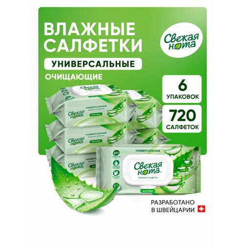 Влажные салфетки с нежным ароматом Алоэ от бренда "Свежая нота" - это универсальное и экономичное решение для всей вашей семьи. Они подойдут как взрослым, так и детям. Салфетки влажные отличная альтернатива мылу и воде, когда они не доступны. Мягкие, плотные салфетки бережно очищают, увлажняют и питают кожу, предотвращая раздражения и воспаления. Универсальные салфетки изготовлены из экологически чистых, безопасных материалов, которые заботятся о вашей коже, сохраняя её здоровой. Использование салфеток для всей семьи поможет поддержать естественный уровень pH кожи. Влажные салфетки для детей и их родителей не содержат спирта и других вредных добавок. Качественный материал эффективно удаляет загрязнения. Универсальные влажные салфетки не мылятся, не прилипают, обеспечивая комфортное использование. Салфетки в пачке защищены от высыхания пластиковым клапаном. В упаковке с клапаном 120 штук, что обеспечивает долгий период использования. Набор влажных салфеток 720 шт - универсальное решение для всей семьи. Одноразовые универсальные влажные салфетки подходят для очищение кожи лица или рук или всего тела в дороге, в машине, в походе, в поезде, самолете, в школе, дома, при уходе за животными, в спортзале. Универсальные влажные салфетки подходят и детям, и взрослым. Будьте уверены в чистоте и свежести кожи всех членов вашей семьи