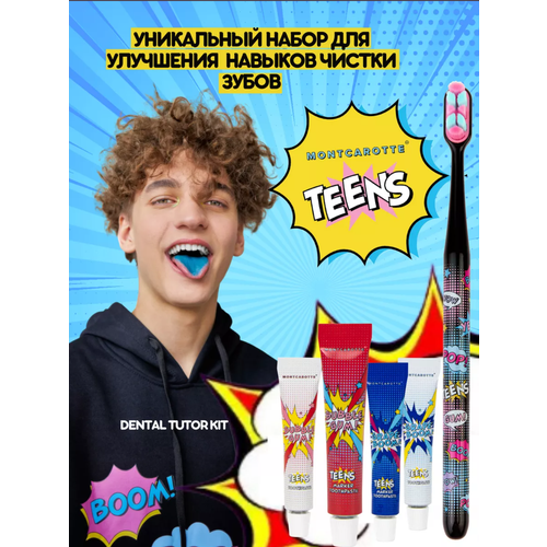 НАЙТИ ВЫГОДНЕЕ - Набор для обучения чистке зубов Montcarotte Teens DENTAL Tutor Kit, зубная щетка + паста 2 шт + маркер (индикатор зубного налета) 2 шт, Монткаротт Тинс, черный, Италия, Южная Корея