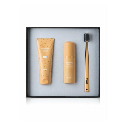Набор "Prosecco Mood" от EMRA - это идеальный баланс. Зубная паста — безупречная защита. Пенка — деликатный уход. Щетка — совершенная чистота. Роскошь, подкрепленная заботой