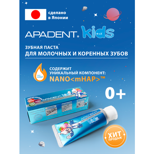 Японская лечебно-профилактическая детская зубная паста Ападент Kids 0+ с Медицинским Нано-Гидроксиапатитом (NANO-mHAP®) создана специально для детей с 0 лет. Нано-Гидроксиапатит® (NANO-mHAP®) - минерал, из которого на 97% состоит зубная эмаль - благодаря нано-размеру частиц и высокой био-совместимости глубоко реминерализует и укрепляет эмаль. В периоды прорезывания молочных зубов и сменного прикуса APADENT Kids 0+ является полноценным источником гидроксиапатита, способствуя более быстрому и качественному насыщению минералами эмали временных и постоянных зубов. Предотвращает развитие кариеса на начальной стадии (белые пятна). Замечательный землянично-виноградный вкус облегчает процесс приучения к чистке зубов - дети будут чистить зубы с удовольствием