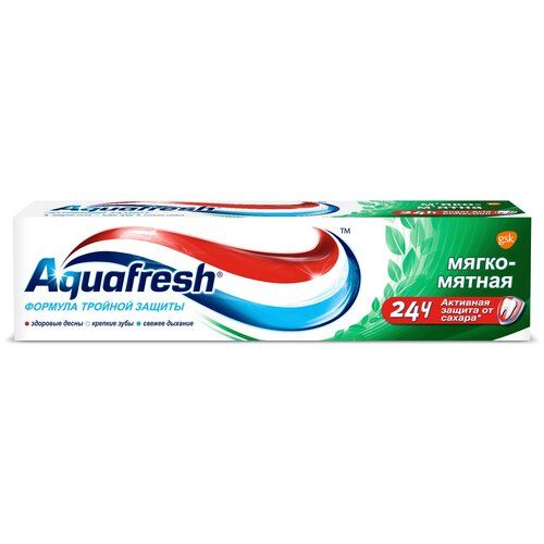 Зубная паста Aquafresh «Мягко - мятная» обладает мятным вкусом и помогает обеспечить тройную защиту полости рта: здоровые десны, крепкие зубы, свежее дыхание. В формуле Sugar Acid Protection фтор помогает защитить поверхность зубов от воздействия кислот, образуемых из сахаров и провоцирующих кариес. Подходит для ежедневного использования. Фторсодержащая формула способствует укреплению зубной эмали, помогая защитить ее от воздействия кислот, вызывающих кариес. Бережно и эффективно устраняет налет, который скапливается в полости рта и является одной из причин болезней десен. Защищает от кариеса и помогает укрепить зубную эмаль. Не маскирует запах, а устраняет основную причину его появления — зубной налет, помогая сохранить свежесть дыхания надолго. Состав: Aqua, Hydrated Silica, Sorbitol, Glycerin, Sodium Lauryl Sulfate, Xanthan Gum, Aroma, Titanium Dioxide, PEG-6, Sodium Fluoride, Sodium Saccharin, Carrageenan, Limonene, Cl 73360, Cl 74160.