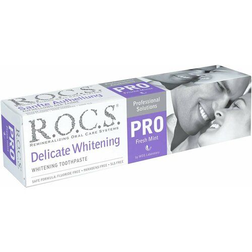 Новая зубная паста R.O.C.S. PRO. "Деликатное Отбеливание" Fresh Mint обеспечивает бережное осветление, полировку зубной эмали и комплексный лечебно-профилактический уход за полостью рта. Она сочетает в себе профессиональные технологии, стоматологические инновации и природную силу натуральных растительных компонентов. Паста для зубов R. O. C. S. PRO. "Деликатное Отбеливание" со вкусом Fresh Mint подходит для регулярного ежедневного использования. Она, без сомнения, понравится тем, кто любит освежающий яркий вкус мяты и выбирает только лучшую защиту для своих зубов и десен. Данная паста подходит как для самостоятельного использования, так и для применения в сочетании с R. O. C. S. PRO Oxywhite "Кислородное отбеливание". Второй вариант позволяет достичь максимального отбеливания эмали. В основе уникальной запатентованной формулы зубной пасты R. O. C. S. PRO. "Деликатное Отбеливание" (Fresh Mint) заложены инновационные профессиональные технологии PRO-Systems: - Prebiotic PRO-SYSTEM - нормализует состав микрофлоры полости рта, а так же, препятствует размножению и прикреплению патогенных бактерий на слизистой и зубах; - Bio Compatibility PRO-SYSTEM - не содержит фтор, красители, лаурисульфат натрия, парабены и консерванты; - Fresh Breath-in PRO-SYSTEM - дарит длительное ощущение свежести, которая ее влияет на восприятие вкуса пищи и сохраняется до нескольких часов; * Enzime and minerals PRO-SYSTEM - защищает от заболеваний пародонта и кариеса; эффективно удаляет окрашенный зубной налет и пигмент, за счет чего возвращается естественный светлый цвет эмали. Активные микрокомпоненты пасты насыщают твердые ткани зуба необходимыми минералами, укрепляя эмаль, а благодаря полирующим свойствам она приобретает красивый здоровый блеск. Указанные положительные свойства подтверждены многократными лабораторными и клиническими исследованиями. Формула зубной пасты уникальна и защищена патентами. Противопоказания Возраст младше 18 лет и индивидуальная (редкая) непереносимость отдельных компонентов состава зубной пасты.