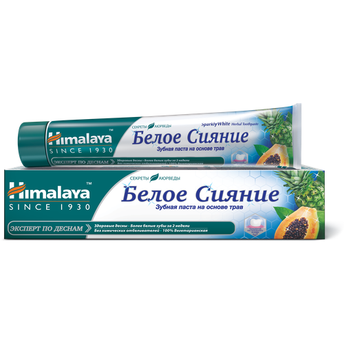 Инновационный растительный состав зубной пасты Himalaya Herbals Sparkly White "Отбеливающая", основанный на ферментативных технологиях растительного сырья - папайи и ананаса, за 2 недели мягко удаляет темные пятна с поверхности зубов, делая их ослепительно белыми.
