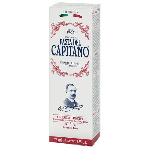Бережно сохраненная и улучшенная формула пасты Pasta del Capitano, выпущенной в Италии в 1905 году. Паста «Оригинальный рецепт» сразу заслужила признание благодаря своему уникальному аромату: листьев гвоздики, мяты и корицы, позволяющему всегда иметь свежее дыхание и улыбаться с удовольствием.