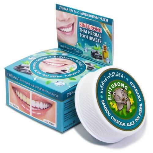 Binturong Bamboo Charcoal Black Thai Herbal Toothpaste — это концентрированная твёрдая зубная паста с бамбуковым углем. Она активно очищает зубы, отбеливает их, нормализует микрофлору полости рта и освежает дыхание. Активные ингредиенты Ментол. Ментол обладает охлаждающими, освежающими и антибактериальными способностями. Он подавляет патогенные бактерии, оптимизирует микрофлору, освежает дыхание и улучшает общее состояние зубов. Камфора. Камфора останавливает воспалительные процессы, успокаивает раздражения и заживляет повреждения в полости рта. Бамбуковый уголь. Бамбуковый уголь обладает очищающими и бактерицидными способностями. Он выводит токсины, удаляет частички еды, обогащает зубы и дёсны минералами и другими ценными микроэлементами. Экстракт чайного дерева. Этот компонент обладает выраженными успокаивающими и противовоспалительными свойствами. Он устраняет болезнетворные проявления и пробуждает иммунитет. Экстракт стрельбуса. Раньше жители Тайланда использовали ветки этого дерева в качестве зубных щёток — настолько хорошо они чистили зубы. Стрельбус блокирует патогенные бактерии, предотвращает появление кариеса, нормализует микрофлору полости рта и освежает дыхание. Преимущества использования Эффект свежести. Паста имеет выраженный ментоловый вкус, который нейтрализует неприятный запах во рту, освежает дыхание и сохраняет этот эффект на целый день. Уход. Концентрированная паста укрепляет и оздоравливает зубы и дёсны, нормализует кислотно-щелочной баланс, создаёт благоприятную микрофлору в полости рта, подавляет патогенные бактерии, останавливает воспалительные процессы и предотвращает развитие инфекционных заболеваний. Эффективное очищение. Паста эффективно удаляет все загрязнения, отбеливает налёт, выводят пятна от чая, кофе и табака, полирует поверхность зубов и предотвращает образование зубного камня. Форма выпуска Паста представляет собой чуть влажноватый зубной порошок, который упакован в шайбообразную пластиковую баночку с изображением зверька. В комплект входит небольшая лопаточка для удобства использования. Объём продукта — 33 мл. Способ применения Откройте баночку и потрите по поверхности пасты влажной зубной щёткой. Того, что на неё налипнет, будет достаточно для процедуры чистки. Затем прополощите рот и почистите зубы своим обычным способом. Прополощите рот ещё, что удалить все частички пасты. Продукт подходит для ежедневного использования. Состав: Ментол кристаллический, камфора, глицерин, ксилитол, D-Limonene, карбонат кальция, аэросил, экстракт листьев Стебелиуса (Streblus Asper) , уголь бамбуковый, масло мяты, имбирное масло, экстракт чайного дерева.