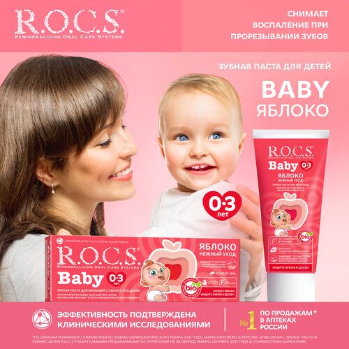 R.O.C.S. Baby «Нежный уход. Яблоко» - детская зубная паста, которая разработана специально для малышей, начиная с самого раннего возраста, с первых зубиков. Благодаря своим свойствам, она облегчает процесс прорезывания зубов, выполняет функции пребиотика, нормализуя состав микрофлоры, обеспечивает эффективную гигиену ротовой полости и бережно ухаживает за первой эмалью, тем самым, укрепляя ее.