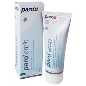Зубная паста Paro amin с аминофторидом предназначена для ежедневного ухода за полостью рта, профилактики кариеса и реминерализации эмали. Пантенол в составе защищает десны и дает противовоспалительный эффект. Аминофторид в концентрации 1250 ppm образует устойчивый слой фторида кальция на поверхностях зубов, который повышает ее устойчивость к воздействию кислот, предотвращая появление кариеса и сильного образования зубного налёта. Рекомендована пациентам с брекет-системой. Зубную пасту рекомендуется использовать с 6 лет.