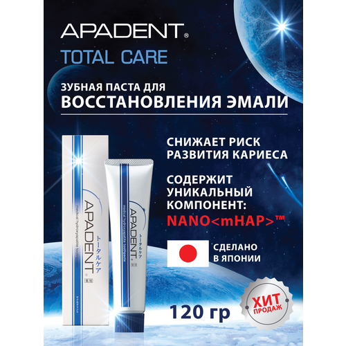 Лечебно-профилактическая зубная паста Ападент Total Care разработана японскими учеными с использованием нанотехнологий. Содержит уникальный запатентованный компонент – Медицинский Нано-Гидроксиапатит (NANO). Благодаря высокой био-совместимости и нано-размеру частиц (до 50 nm) он восстанавливает эмаль глубоко изнутри, а не только на поверхности, в отличие от других зубных паст. Избавляет от чувствительности зубов путем запечатывания дентинных канальцев. Предотвращает развитие кариеса и борется с ним на начальной стадии (белого пятна). Эффективно удаляет налет и предотвращает его появление. Дарит ощущение гладкости и чистоты зубов в течение дня.