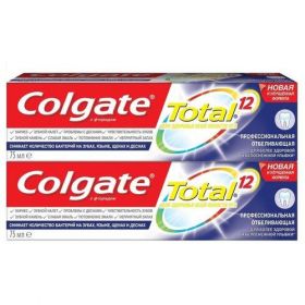 Colgate Зубная паста Total 12 "Професиональная отбеливающая", 75 мл, 2 шт. Уверенная и привлекательная улыбка начинается с белоснежных зубов и здоровья всей полости рта. Поэтому передовая формула нового Colgate Total 12 Профессиональная Отбеливающая помогает не только бороться с потемнениями на эмали, но также борется с бактериями на зубах, языке, щеках и деснах в течение 12 часов, обеспечивая здоровье всей полости рта. Новая зубная паста Colgate Total 12 Профессиональная Отбеливающая содержит передовую формулу, которая помогает бороться с потемнениями на эмали для более белоснежной улыбки. Она также борется с бактериями не только на зубах, но и на языке, щеках и деснах в течение 12 часов для здоровья всей полости рта. Colgate Total 12 Профессиональная Отбеливающая ежедневно обеспечивает превосходную защиту от налета, признаков воспаления десен при борьбе с бактериями, нейтрализацию неприятного запаха изо рта, защиту от разрушения эмали, повышенной чувствительности зубов, кариеса, налета, зубного камня, потемнений на эмали и проблем с деснами. В комплекте 2 уп.