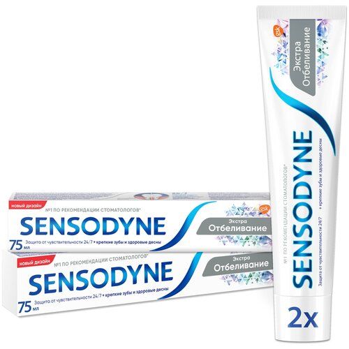 Зубная паста Sensodyne Экстра Отбеливание Ежедневный уход 75 мл. х 2 шт. Зубная паста Sensodyne Экстра Отбеливание эффективно снижает повышенную чувствительность зубов, обеспечивает защиту от чувствительности в течение всего дня, а также помогает удалять потемнения зубной эмали, восстанавливая естественную белизну зубов. При чистке зубов 2 раза в день паста Sensodyne Экстра Отбеливание также защищает от кариеса благодаря содержанию фтора.