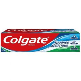 Зубная паста Colgate Тройное Действие Натуральная мята 100 мл. Зубная паста Colgate Тройное Действие обеспечивает максимальную защиту от кариеса. Эта трехцветная зубная паста оказывает тройное действие: помогает защищать зубы от кариеса, помогает удалять потемнения с поверхности зубов, тем самым делая зубы белее, освежает дыхание. Colgate Тройное Действие обладает приятным мятным вкусом. Также содержит кальций, который способствует глубокому очищению эмали. Защищает зубы от кариеса.