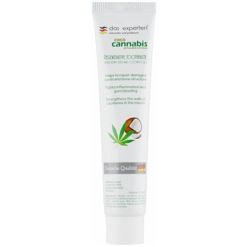 Зубная паста регенерирующая - Das Experten Coco Cannabis (70 g). Зубная паста с маслом кокоса и канабис. Для здоровья зубов и десен выбирайте зубную пасту, которая основана на натуральных компонентах. Das Experten Coco Cannabis – это мягкое очищающее средство, которое способствует устранению загрязнений ротовой полости, предотвращает кариес и воспаления. Зубная паста с маслами кокоса и канабис подходит даже для чувствительных зубов и десен, не вызывает раздражение и кровоточивость. Особенности Das Experten Coco Cannabis: - формула на основе масла канабис, которое стимулирует восстановление косной ткани и укрепление эмали;- деликатно устраняет налет и остатки пищи, защищая от кариеса;- способствует предотвращению образования зубного камня;- укрепляет стенки капилляров в ротовой полости;- эффективно оздоровляет и защищает десны;- освежает дыхание. Способ применения: пользуйтесь зубной пастой ежедневно два раза в день, утром и вечером.