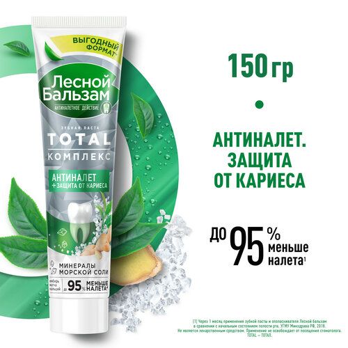 Попробуй новую зубную пасту для комплексной защиты полости рта - Лесной бальзам TOTAL Комплекс с морской солью, экстрактом имбиря и чаем матча, в составе которой 95% ингредиентов натурального происхождения.